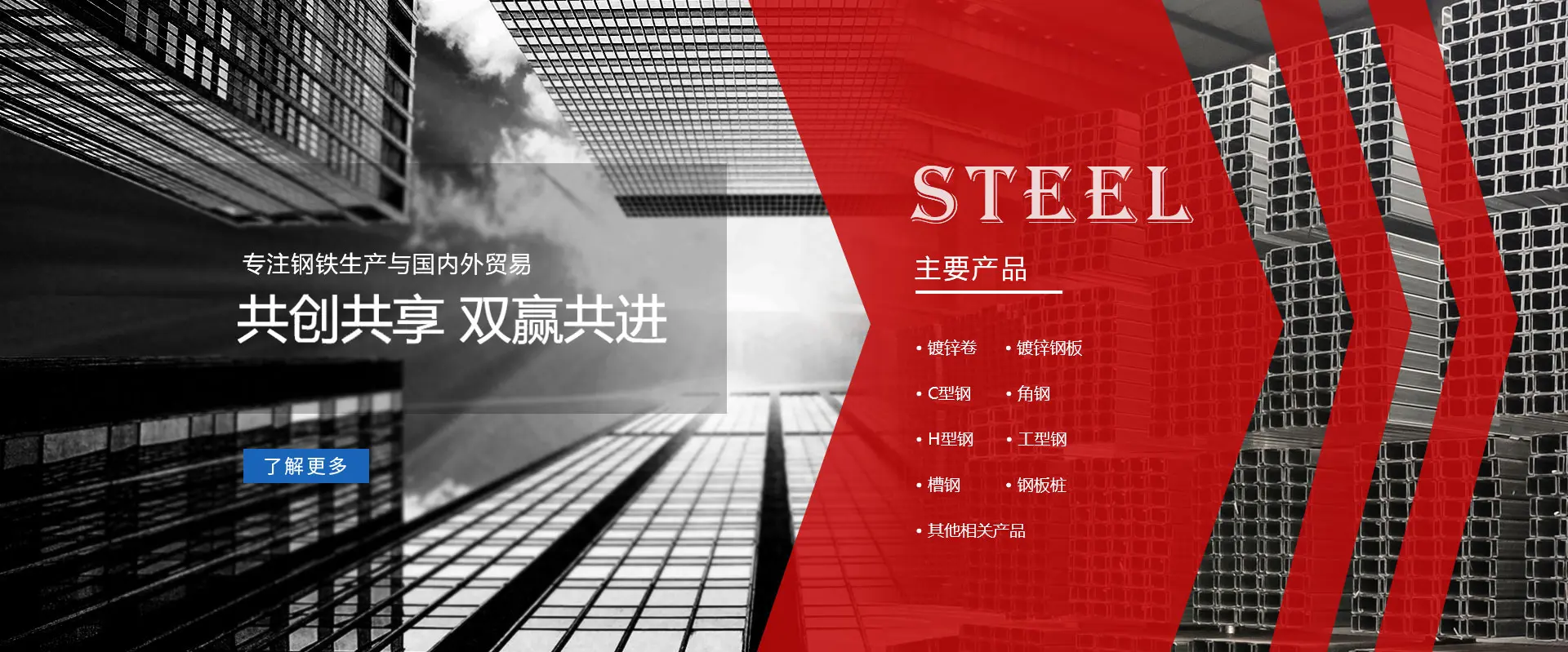 我们的主要产品有镀锌卷、镀锌钢板、C型钢、角钢、H型钢、工型钢、槽钢、钢板桩以及其他钢铁相关产品。