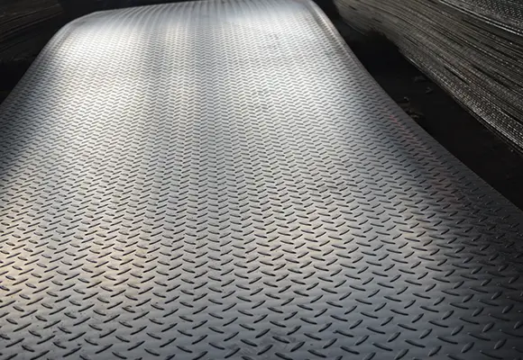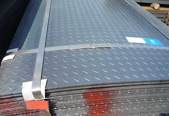 Diamond plate steel sheet, also known as chequered plate or checkered plate. Embossed diamond pattern (1.5-3.0mm height) on Q235 steel Plate. High slip resistance Diamond Plate Sheet for industrial flooring and ramps.